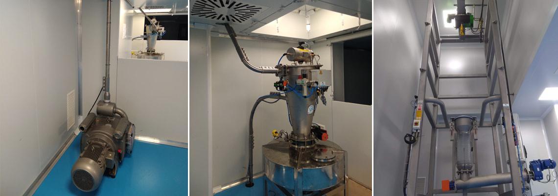 La transferencia neumática funciona a través de una bomba de vacío eléctrica remota del área de producción. Una tolva colocada debajo de la transferencia neumática garantiza el suministro continuo del proceso teniendo en cuenta el funcionamiento del ciclo por lotes de la bomba de polvo.