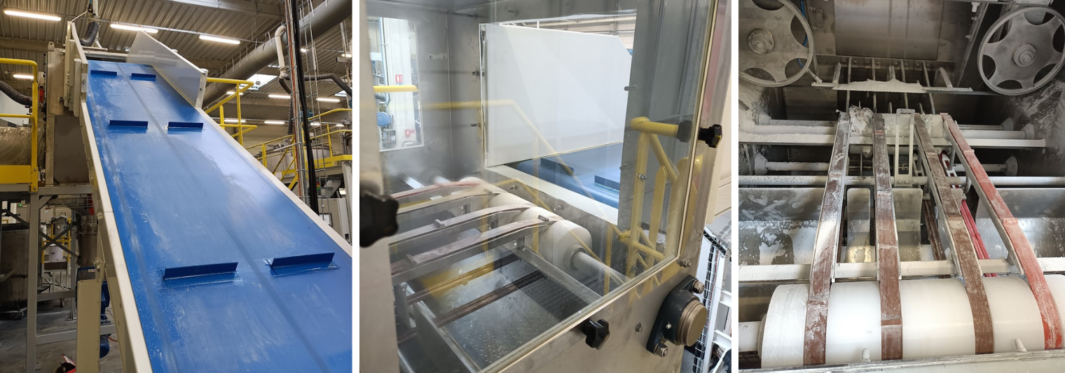 La alimentación de la línea comienza con un transportador inclinado motorizado que asegura el transporte regular de los sacos de ácido sebácico hacia el desempacador automático Minislit 3000. Este modelo está diseñado para tratar diferentes tipos de sacos sin necesidad de ajustes previos, con una velocidad de hasta 5 sacos/minuto. El saco se abre mediante una sierra de cinta que corta el saco en tres lados, mientras que un sistema patentado de volteo garantiza un vaciado completo. Los sacos vacíos se compactan automáticamente para reducir el volumen de los desechos.
