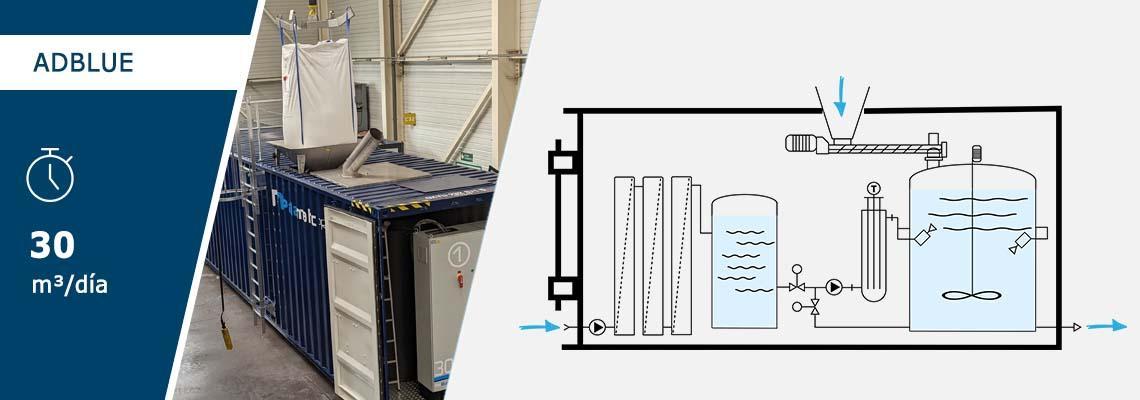 Todo lo que se requiere para producir AdBlue es un suministro de agua de buen tamaño y urea que cumpla con las normas de AUS32. El skid PalBlue® Skid 15 está integrado en un contenedor de 20 pies (medio contenedor) para proporcionar una producción de hasta 15 m³ de AdBlue por día. La versión extendida, el PalBlue® Skid 30, permite una producción de 30 m³ / día.