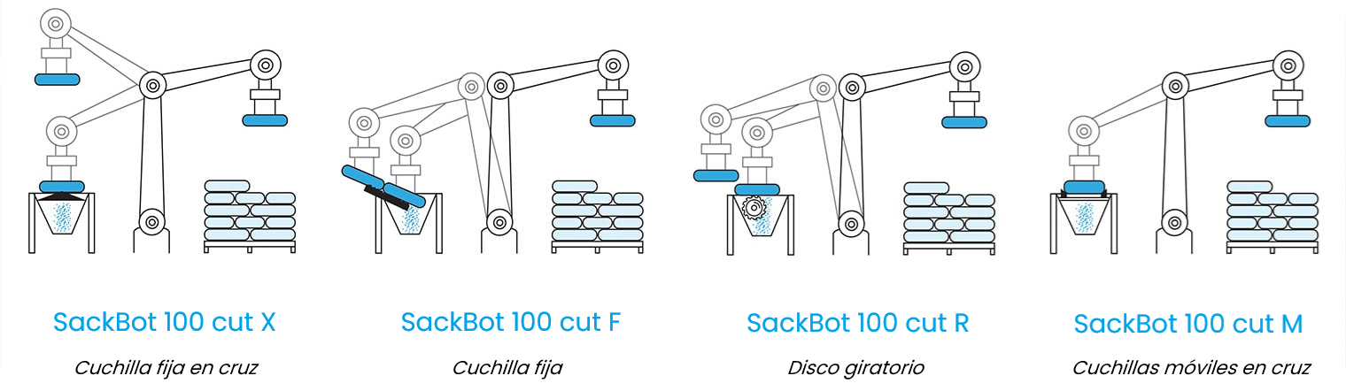 La gama SackBot serie 100, que incluye los modelos SackBot 100 cut X, SackBot 100 cut F, SackBot 100 cut R y SackBot 100 cut M, ha sido diseñada para responder a los desafíos modernos de manipulación y descarga de sacos en los entornos industriales más exigentes.